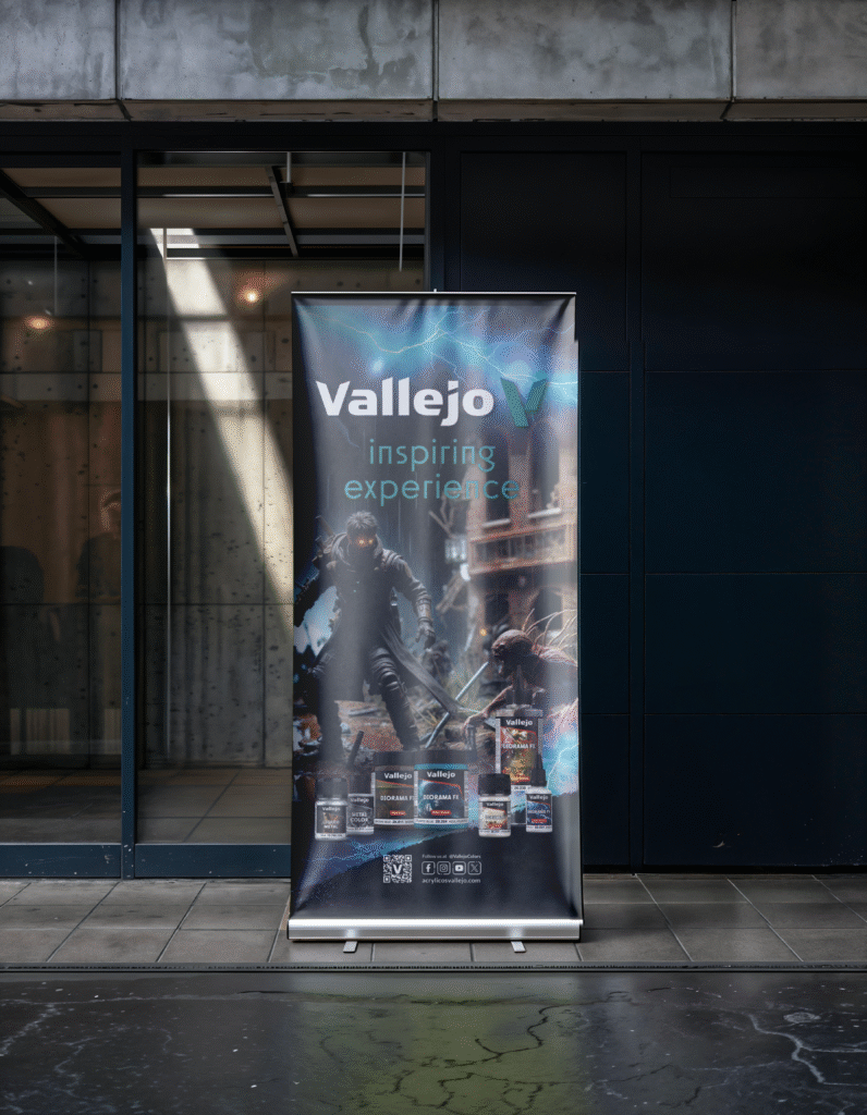 The project required the development of versatile designs that could adapt to different dimensions without losing visual coherence. Each roll-up needed to stand out in busy event halls, capture attention from a distance, and remain faithful to Vallejo’s established brand guidelines while presenting a wide range of products.